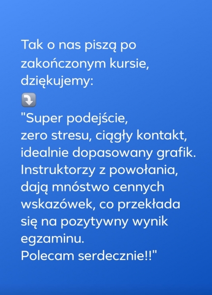 Egzamin zdany za 1 razem, teoria w wygodnej formie zdalnej. Podczas jazd rzeczowe odpowiedzi na pojawiające się pytania :)