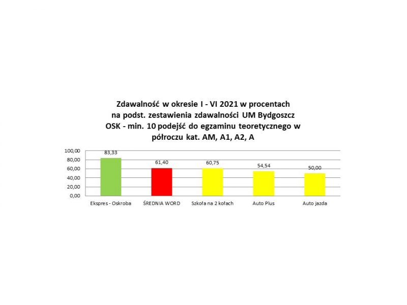 Szkoła nauki jazdy Ekspres-Oskroba Adam Oskroba powstała w 2006 roku. W okresie 19 lat wyszkoliliśmy prawie 5000 kierowców, z czego większość zdała ten trudny egzamin za pierwszym razem. Potwierdzają ten fakt wysokie miejsca w zestawieniach zdawalności publikowanych przez Wydział Uprawnień Komunikacyjnych UM Bydgoszcz. Dewizą naszej pracy jest profesjonalizm i skuteczność szkolenia. Zdecydowana większość naszych absolwentów trafiła do naszej szkoły z polecenia osób wyszkolonych. Infrastruktura ośrodka: plac manewrowy, sala wykładowa i biuro znajdują się na terenie CWZS Zawisza. Z tego terenu wyjeżdżamy bezpośrednio na trasy egzaminacyjne co jest dodatkowym atutem. W szkole zatrudnionych jest ośmiu doświadczonych instruktorów i ratownik medyczny. Do szkolenia używamy samochodów Opel Corsa oraz motocykli i motorowerów marki Yamaha.