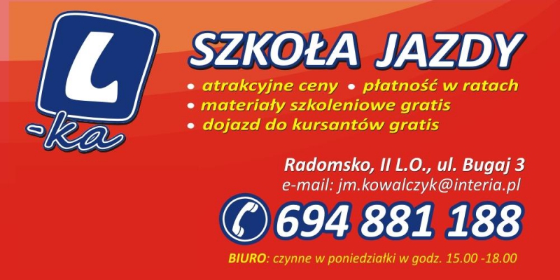 Szkoła Jazdy L-ka oferuje kursy na prawo jazdy kat. B. Cena kursu to 1.250 zł. Za kurs można zapłacić w ratach (0%).