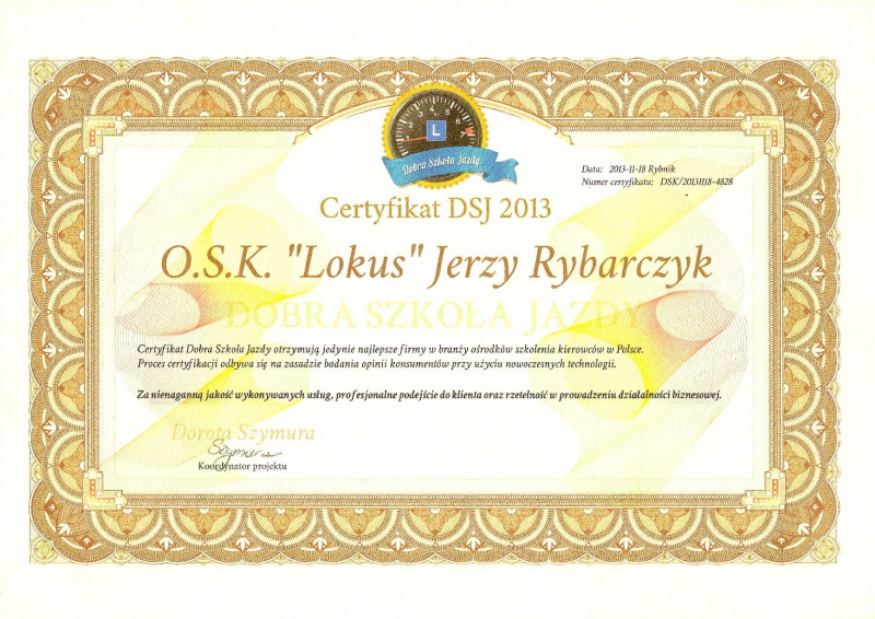 Certyfikat Dobrej Szkoły Jazdy jaki otrzymują najlepsze firmy w naszej branży - patrz GALERIA