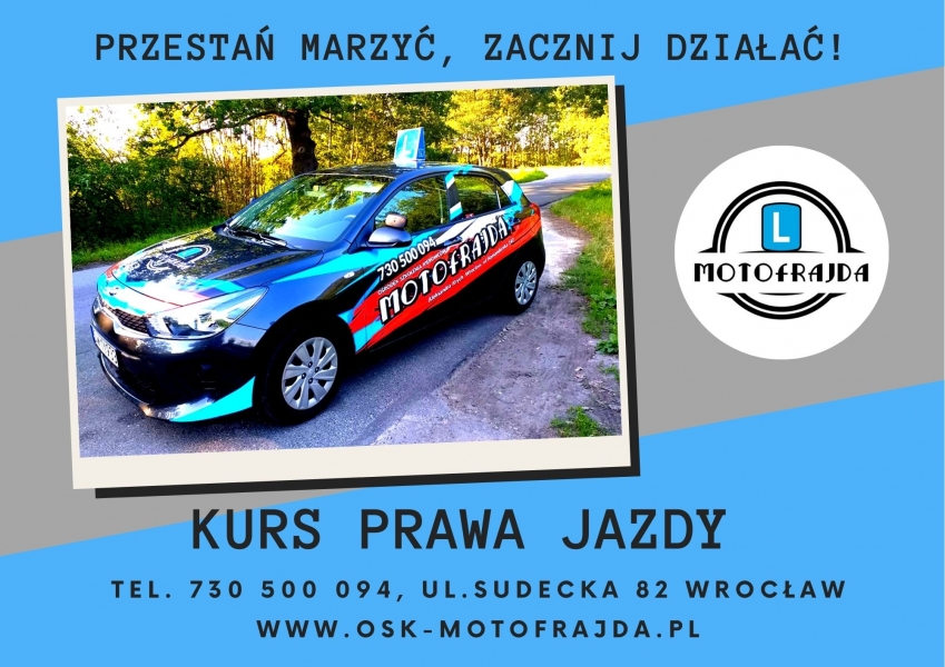 Polecam ,,Motofrajdę,, -najlepsza szkoła jazdy we Wrocławiu!!! Bardzo sprawnie przeprowadzony kurs nauki jazdy ,fajne wykłady bez zbędnego przeciagania. Mili ,cierpliwi i profesjonalni instruktorzy z ogromną wiedzą i pasją podchodzą do swojej pracy i co ważniejsze, potrafią ta wiedzę i umiejętności przekazać przyszłym kierowcom. Panuje tutaj fajna ,rodzinna atmosfera ,bez zbędnego stresu ,a nauka przebiega w miłej atmosferze. Jeździłam ze wszystkimi instruktorami i każdego mogę polecić, ale najwięcej godzin wyjeździłam z p.Arturem I Radkiem. Świetni ludziei jestem im wdzięczna za to ,że nauczyli mnie jeździć po Wrocławiu, za perfekcyjne przygotowanie do egzaminu,za życzliwość, ciepłe słowo,ogromną cierpliwość i za to ,że uwierzyłam w siebie I swoje możliwości ,za uśmiech i zaraźliwy pozytywizm( szczególnie Radkowi za dzisiejsza jazdę przed tym stresującym Egzaminem państwowym) Panowie... jesteście po prostu The Best !!! Bardzo polecam naukę w ,,Motofrajdzie,, ponieważ nauka jazdy z nimi to naprawdę frajda!