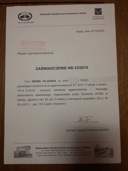 Instruktorka nauki jazdy w Kaliszu od 1999 r.Uczy jeździć od 1999 roku na kat. B.Uprawnienia instruktora na kat. C posiada od 2010 r. Od 2010 r. posiada też uprawnienia EGZAMINATORa na kat. B, B1, B+E, T.Zapraszamy do Ośrodka Szkolenia Kierowców IWONA :) Oferujemy: - kurs kat. B - w tym profesjonalne wykłady i naukę jazdy w Kaliszu, - jazdy doszkalające dla kandydatów na kierowców i kierowców, - auto - ten sam model co na egzaminie, - plac manewrowy zgodny z instrukcją egzaminowania, - możliwość wjazdu na plac WORD, - wysoką zdawalność, - naukę w bezstresowej i miłej atmosferze, - podręcznik do nauki teorii i dostęp do aktualnej bazy z pytaniami, - bony upominkowe :)Naukę prowadzi doświadczona instruktorka kat. B (od 1999 r.) z uprawnieniami EGZAMINATORA kat. B i instruktora kat. C (od 2010 r.).Zapisy pod nr telefonu 501 464 981. Zapraszamy :)Zapraszamy również na facebook.com: Nauka Jazdy Iwona Pilarska