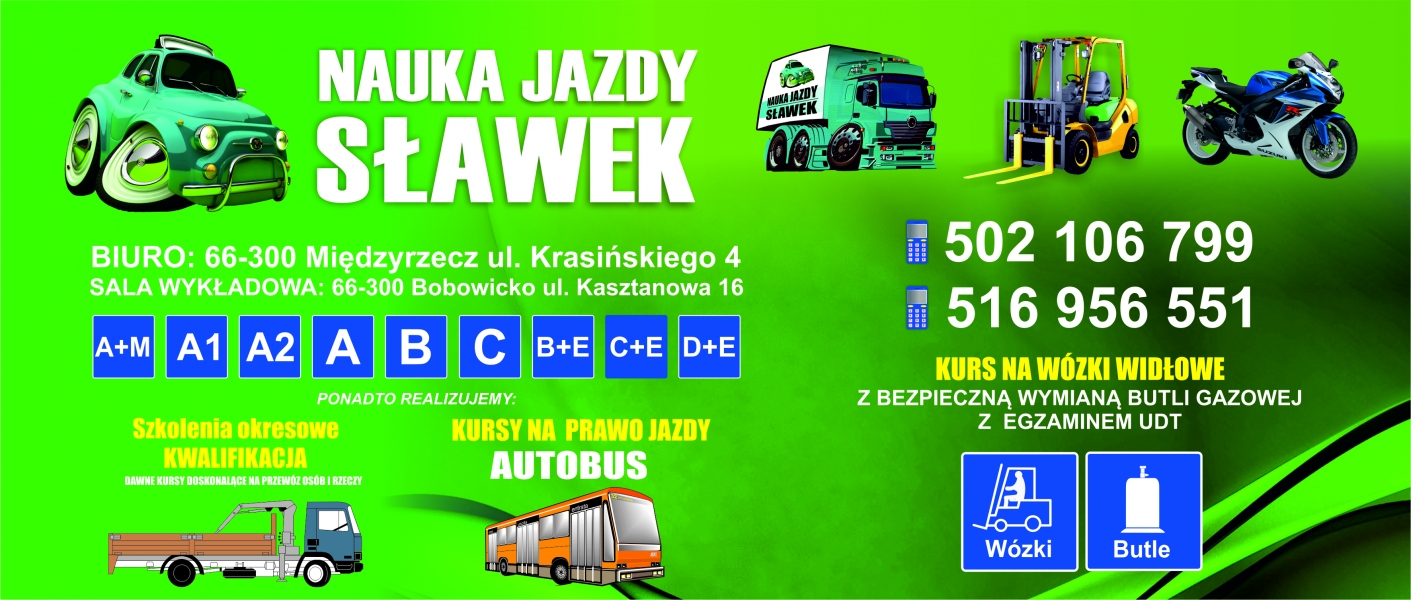 Jestem z okolic Gorzowa. Polecam Ośrodek Szkolenie Kierowców "Nauka Jazdy Sławek ". Firma jest z Międzyrzecza ale wszystkie kategorie prowadzi w Gorzowie Wlkp. Polecam plac manerwrowy oraz pojazdy takie same jak w WORD Gorzów Wlkp. Osobiście uzyskałem wszystkie kategorie prawa jazdy. Wielkie podziękowania dla Ośrodek Szkolenie Kierowców "Nauka Jazdy Sławek ".