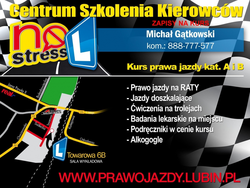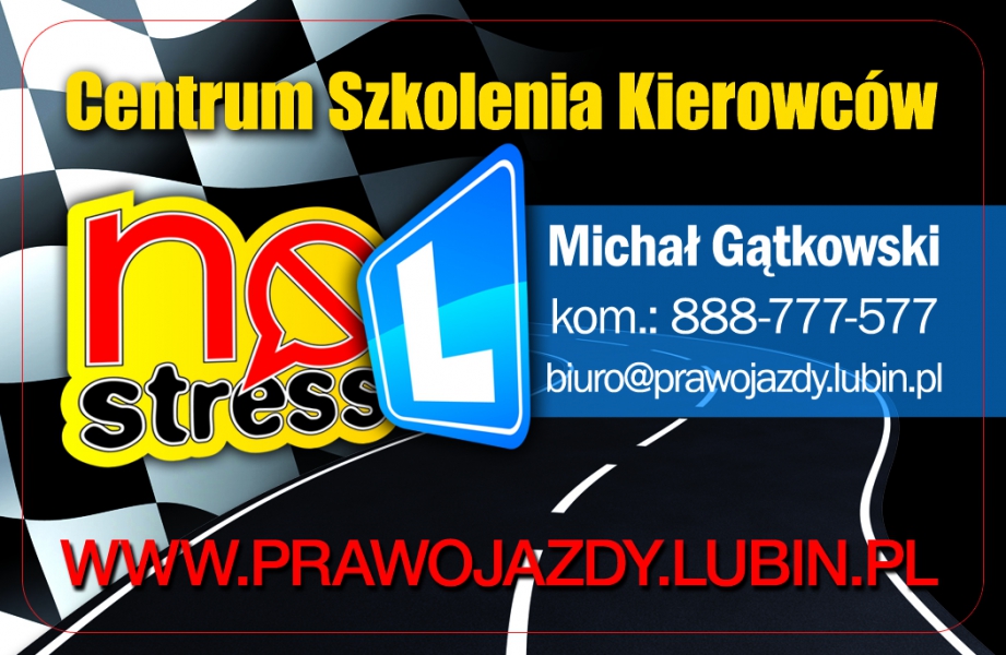 Oferujemy: Kursy prawa jazdy kat. AM, A1, A2, A i B oraz jazdy doszkalające Szkolenie samochodami Toyota Yaris 1.0 III wszystkie pojazdy z klimatyzacją Szkolenie motocyklem Suzuki Gladius 650, KTM Duke 125, motorowerem Romet ZK 50 Wykwalifikowaną kadrę instruktorów Opłata za kurs w nieoprocentowanych ratach Współpraca z lekarzem, badania lekarskie na miejscu Materiały i pomoce dydaktyczne w cenie kursu Alkogogle Fantom do udzielania pierwszej pomocy Terminy jazd i wykładów dostosowane do potrzeb kursantów Plac manewrowy identyczny z egzaminacyjnym Multimedialna, klimatyzowana sala wykładowa 6 stanowisk komputerowych do rozwiązywanie testów teoretycznych Miła atmosfera, komfortowe warunki i profesjonalne szkolenie JUŻ CZWARTY ROK Z RZĘDU SZKOŁA Z NAJWYŻSZĄ ZDAWALNOŚCIĄ ZA PIERWSZYM PODEJŚCIEM WG RANKINGU WORD W LEGNICY2014r. 55,42%I PÓŁROCZE 2014r. 57,89%2013r. 57,14%2012r. 60,70%I PÓŁROCZE 2012r. 57,90%2011r. 56,80%