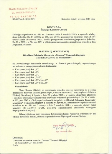Wszyscy nasi instruktorzy (każdy niepalący) posiadają WYKSZTAŁCENIE WYŻSZE wraz z PRZYGOTOWANIEM PEDAGOGICZNYM zdobyte na uczelniach technicznych o profilu samochodowym lub konstrukcyjno-maszynowym, dzięki czemu uzyskaliśmy AKREDYTACJĘ ŚLĄSKIEGO KURATORA OŚWIATY. Właśnie to różni nas od innych OSK w okolicy. Kadra instruktorska była kompletowana z myślą o Państwu, aby zagwarantować wszystkim naszym kursantom najwyższą jakość szkolenia. Nie ma dla nas lepszej rekomendacji, niż Państwa opinie, które znajdują się poniżej. Cieszymy się z nich tym bardziej, że portal superprawojazdy.pl jest od nas niezależny i nie mamy żadnego wpływu na ich treść (nie możemy usuwać ani edytować otrzymanych opinii). Gwarantujemy cierpliwość, elastyczność godzin oraz indywidualne podejście do każdego kursanta.