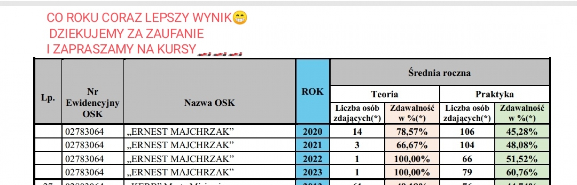 Witam , gorąco polecam OSK Pana Ernesta Majchrzaka . Dzięki instruktorom tej szkoły bez żadnego wyjątku, zdałem egzamin za pierwszym razem i nie wiem czy inna szkoła dałaby mi ten sam efekt. Innych już nie sprawdzę , ale co do tej jestem pewny , że pracują w niej bardzo profesjonalni i sympatyczni ludzie . Widać latami wypracowany system , który się fenomenalnie sprawdza. Biorąc pod uwagę średnią wieku ludzi , którzy robią prawko to jestem już sporo powyżej średniej mam 37 lat i też już trochę się na ludziach poznałem i myślę , że wiem co mówię drodzy niezdecydowani kursanci " ruszajcie do OSK Ernest Majchrzak słuchajcie sumiennie, a nim się obejrzycie będziecie jeździć samodzielnie na wymarzone wycieczki.