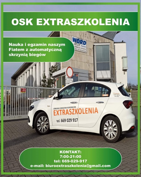 Zdecydowanie polecam naukę w OSK EXTRASZKOLENIA. Ciekawe wykłady z wieloma praktycznymi wskazówkami, nie robione na "odwal się" - z każdych można było wynieść cenne informacje. Kurs pierwszej pomocy klasa sama w sobie. Zajęcia praktyczne na bardzo wysokim poziomie, po 30h z dużą wiarą w swoje umiejętności będę podchodził do egzaminu państwowego, a początek wcale na to by nie wskazywał ;-) Wyrazu uznania dla Panów Krzysztofa i Juliana ( najwięcej jazd z nimi) za fachowe przygotowanie i cierpliwość, bo z mojej strony bywało różnie :P Powtórzę się, ale zdecydowanie polecam OSK EXTRASZKOLENIA, naprawdę extra szkolą!