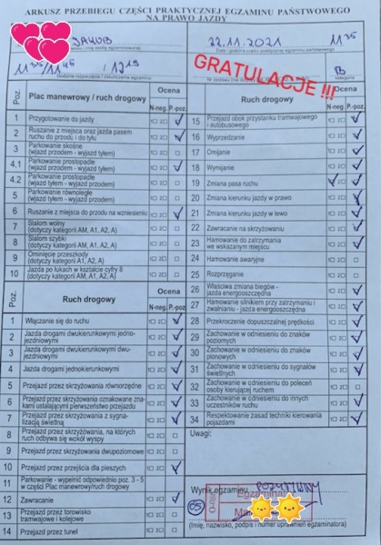 Serdecznie polecam szkołę, panuje tam miła i spokojna, domowa atmosfera! Zawsze pomocni, wszystko zorganizowane na czas i na najwyższym poziomie. Każda jazda to przyjemność, super poczucie humoru i zaliczony egzamin za pierwszym razem, bez stresu i z uśmiechem na twarzy???? Polecam!!!