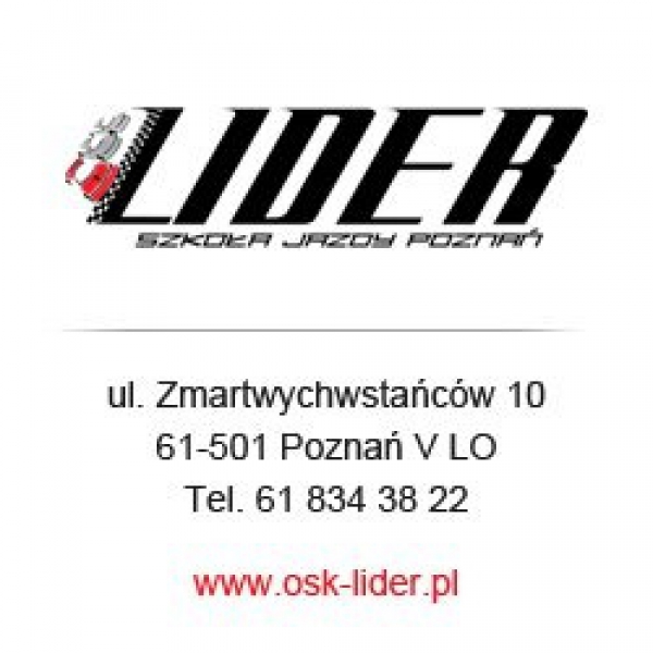 OSK LIDER to najlepsza szkoła jazdy w Poznaniu! Wyśmienita atmosfera, wspaniali ludzie i profesjonaliści w swoim fachu! Zarówno szkolenie teoretyczne, jak i praktyczne przeprowadzone profesjonalnie i w bardzo miłej atmosferze. Za instruktora z całego serca polecam p. Mirosława Łoteckiego, niesamowity człowiek i fachowiec ;)) Teoria i praktyka zdana za pierwszym razem. Dziękuję OSK LIDER! ;))