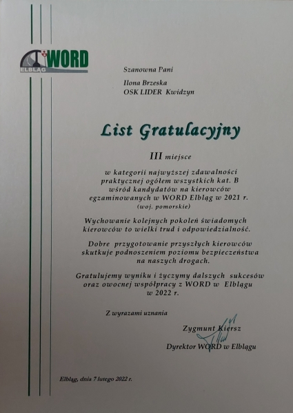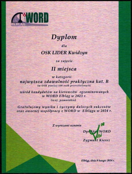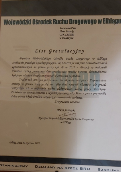Pełen profesjonalizm, indywidualne podejście do każdego kursanta. Miła i przyjazna atmosfera. Lider to najlepsza szkoła nauki jazdy. Polecam każdemu.