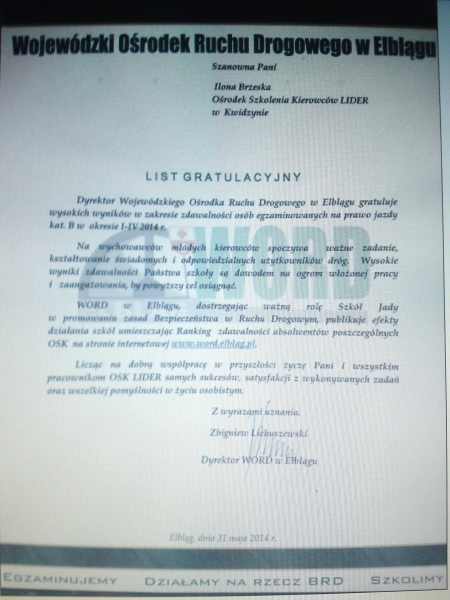 Kochani Kursanci to dzięki Wam mamy te wyróżnienia , to dzięki Wam istnieje Ośrodek Szkolenia Kierowców LIDER i to dzięki Wam mamy taką zdawalność ponieważ WSPÓLNIE na To.pracujemy.