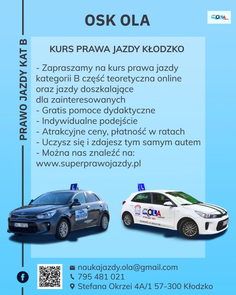 OSK Ola&Konrad w Kłodzku to szkoła, w której gruntownie przygotujemy Cię do egzaminu na prawo jazdy jak i do późniejszej bezpiecznej i bezstresowej jazdy. Skuteczność, doświadczenie oraz indywidualne podejście do każdego kursanta to cechy wyróżniające OSK OLA. Masz więc pewność, że instruktor poświęca Ci odpowiednią ilość czasu, właściwie przygotowując Cię do państwowego egzaminu. Organizujemy kursy na prawo jazdy kat B ( stacjonarne oraz ONLINE ), przygotujemy Cię do egzaminu dopasowując do Twoich możliwości czasowych. Zajęcia teoretyczne tj. 30 godzin prowadzone są w pełni wyposażanej w pomoce dydaktyczne sali wykładowej, w tym 4 godziny z zakresu Pierwszej Pomocy prowadzonej przez doświadczonego Ratownika Medycznego, możliwość odbycia wykładów części teoretycznej ONLINE bez wychodzenia z domu. Kolejna część naszego kursu to część praktyczna, która odbędzie się na nowym i dobrze wyposażonym pojeździe z dynamicznym silnikiem 1.2 o mocy 84 KM KIA RIO, wyposażonym między innymi w kamerę oraz czujniki cofania. Jazdy prowadzone są na pełnowymiarowym placu manewrowym oraz w ruchu miejskim. Po zakończonych jazdach w miłej i wesołej atmosferze zdasz swój egzamin państwowy na naszym aucie Kia Rio na którym do tej pory uczyłeś, uczyłaś się jeździć, co za pewne pomoże w zdaniu egzaminu i uzyskaniu prawa jazdy. Nasza oferta obejmuje również jazdy doszkalające dla osób które chcą poszerzyć swoje umiejętności, lub uzupełnić je, tuż przed egzaminem państwowym. Każdy kursant GRATIS otrzymuje pomoce dydaktyczne w postaci książek, płyt CD, aplikacje na smartfony i tablety.