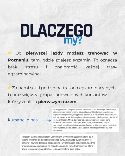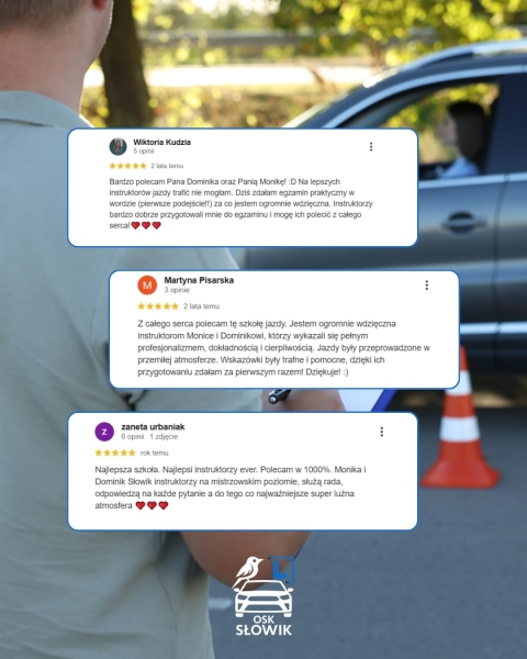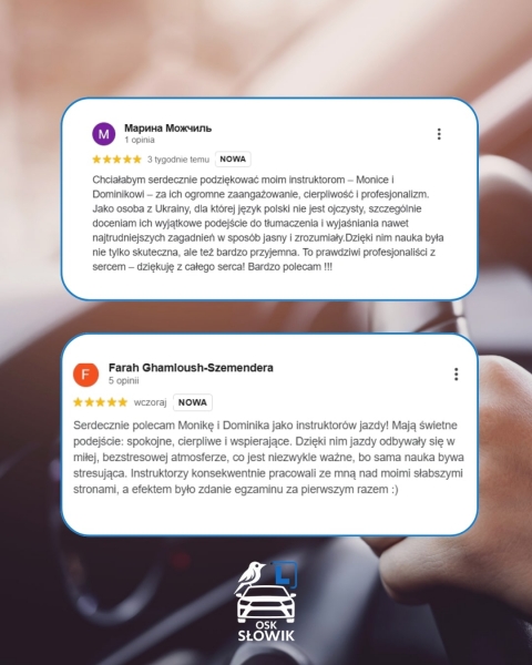 Serdecznie polecam Monikę i Dominika jako instruktorów jazdy! Mają świetne podejście: spokojne, cierpliwe i wspierające. Dzięki nim jazdy odbywały się w miłej, bezstresowej atmosferze, co jest niezwykle ważne, bo sama nauka bywa stresująca. Instruktorzy konsekwentnie pracowali ze mną nad moimi słabszymi stronami, a efektem było zdanie egzaminu za pierwszym razem :)