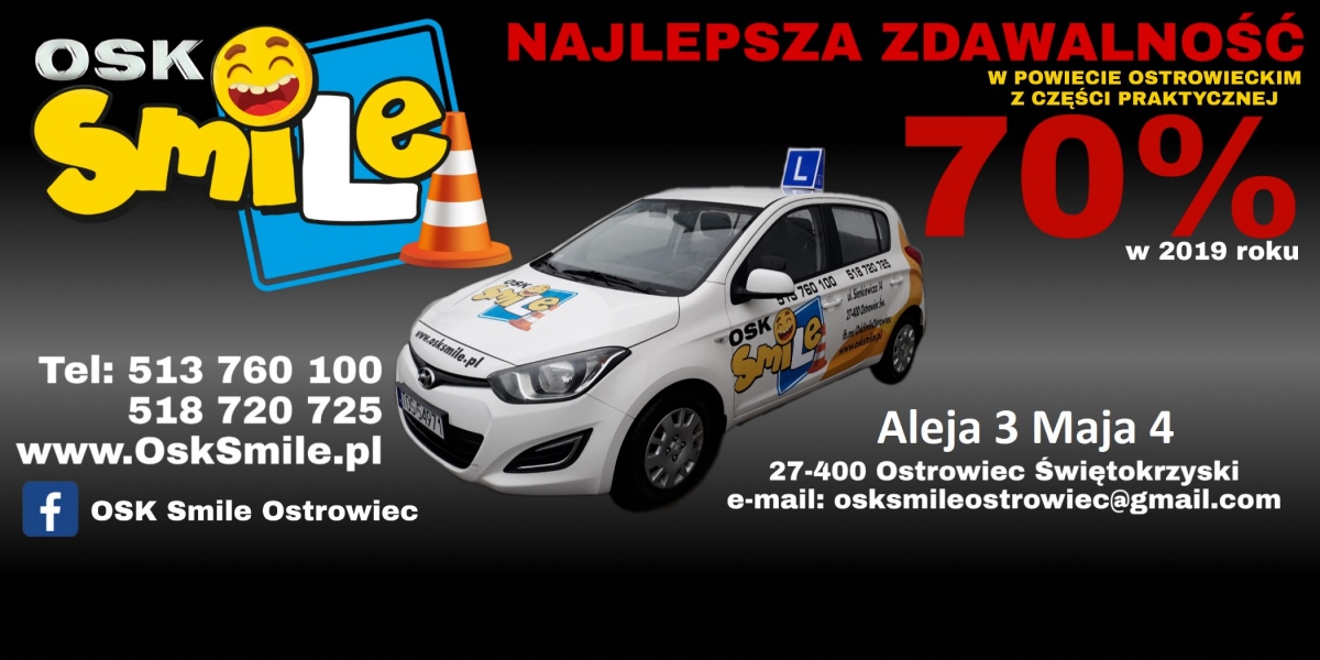 Do Państwa dyspozycji mamy nowocześnie wyposażoną salę wykładową ze wszystkimi potrzebnymi pomocami naukowymi.Nasza szkoła znajduje się w centrum miasta (Aleja 3 Maja 4), blisko parku miejskiego. Ćwiczymy na placu manewrowym (ul. Żabia 40) naprzeciwko dworca PKS, co pozwala oszczędzić czas na dojazdy.Mamy wieloletnie doświadczenie jako instruktorzy nauki jazdy. Wyszkoliliśmy wielu zadowolonych klientów. Teraz postanowiliśmy połączyć swoje siły i stworzyć nową szkołę jazdy OSK Smile. Cechuje nas innowacyjność oraz indywidualne podejście do klienta. Jako pierwsi na terenie powiatu Ostrowieckiego wprowadziliśmy możliwość zdawania autem, którym się uczycie.