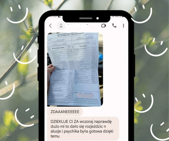 Nie wyobrażam sobie uczynić się z kimś innym, aniżeli Łukasz! Potrzebowałam godzin dodatkowych i wybór OSK Szerokości był strzałem w dziesiątkę. Pełna wyrozumiałość Instruktora daje mega komfortowe warunki nauki. Atmosfera - złoto! Do tego super elastyczność godzinowa. Naprawdę szczerze polecam.