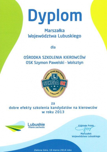 19 marca 2014 otrzymaliśmy prestiżową nagrodę SZKOŁA OK. Zajęliśmy 2 miejsce w szkoleniu kandydatów na kierowców i tym samym znaleźliśmy się w czołówce OSK na terenie obsługiwanym przez zielonogórski WORD