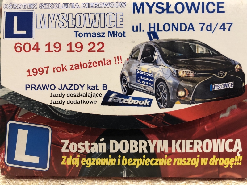 Jesteśmy jedną z najdłużej działających szkół Nauki Jazdy w Mysłowicach - od 1997 roku - tylko tyle i aż tyle. Doświadczenie = profesjonalizm. Pomogliśmy w uzyskaniu prawa jazdy kilkuset kursantom. Zadowolenie kursantów i pełen profesjonalizm w szkoleniu. Dla nas najważniejszy jest kursant. Możliwość zdawania egzaminu na samochodzie OSK - na którym się uczyłeś - na tym zdajesz. Uczymy nie tylko ,, pod egzamin ". Nasze motto: Jeśli jesteś zadowolony - powiedz innemu , jeśli nie - powiedz mnie. Serdecznie zapraszamy.