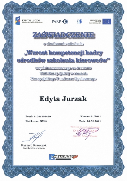 UWAGA przyszli kursowicze! Szkoła jazdy "EDYTA" to miejsce, w której uczą instruktorzy CU-DO-TWÓR-CY! Przede wszystkim wsparcie, motywacja, cierpliwość i niebywałe zaangażowanie, to wszystko otrzymujemy wraz z książką do nauki w pakiecie. Prawo jazdy wykupiłam w swoim życiu po raz piąty. Uczyłam się w tego typu szkołach już od 18ego roku życia. Sokółka, Białystok, Poznań, 2 x Bielsko... Nigdy nie podchodziłam do egzaminów bo czułam, że nie jestem na tyle dobrze przygotowana by zdać, a już na pewno nie na tyle, by być samodzielnym kierowcą. Dopiero tu, w wieku 46 lat zdałam! I to za pierwszym podejściem????Egzaminator stwierdził, że jeżdżę bardzo dobrze. Ja- leciwa;), roztrzepana, nerwus do entej potęgi dałam radę. Tu kieruję moje najszczersze podziękowania Panu Czesławowi. Doświadczony, cierpliwy, bardzo mądry instruktor przez duże I. Panie Czesiu, niech nam Pan żyje 100 lat w zdrowiu, i uczy jak najdłużej przyszłych kierowców. Jest Pan do tego stworzony. Dziękuję!