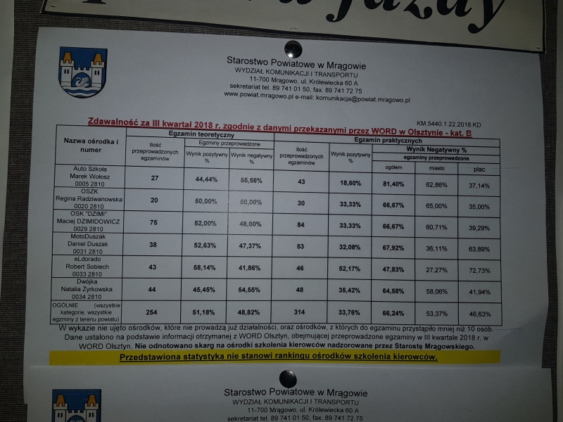 Jeśli myślicie o zrobieniu prawa jazdy kategorii B - zapraszamy do naszej szkoły. Czas spędzony na szkoleniu w naszej szkole z pewnością nie będzie dla Was czasem straconym. Uczymy nie tylko jak zdać egzamin państwowy, ale przede wszystkim jak bezpiecznie poruszać się po drogach.Dodatkowo możemy pochwalić się najwyższą zdawalnością egzaminów praktycznych w powiecie Mrągowskim potwierdzoną przez WORD Olsztyn i Starostwo!!! :)W każdy poniedziałek i środę o godz 16.00 startujemy z zajęciami w biurze przy ul. Wojska Polskiego 3/4 w MrągowieSerdecznie zapraszam :)Nasza oferta :Kurs podstawowy ( 30h teorii i 30h praktyki) - cena 2000 złKurs rozszerzony ( 30h teorii i 40h praktyki) - cena 2550 złDodatkowa godzina jazdy - cena 70 złMateriały szkoleniowe - Gratis!!! Sprawdź dodatkowo nasze aktualne promocje na stronie internetowej :www.eldorado.mragowo.plSerdecznie zapraszam !