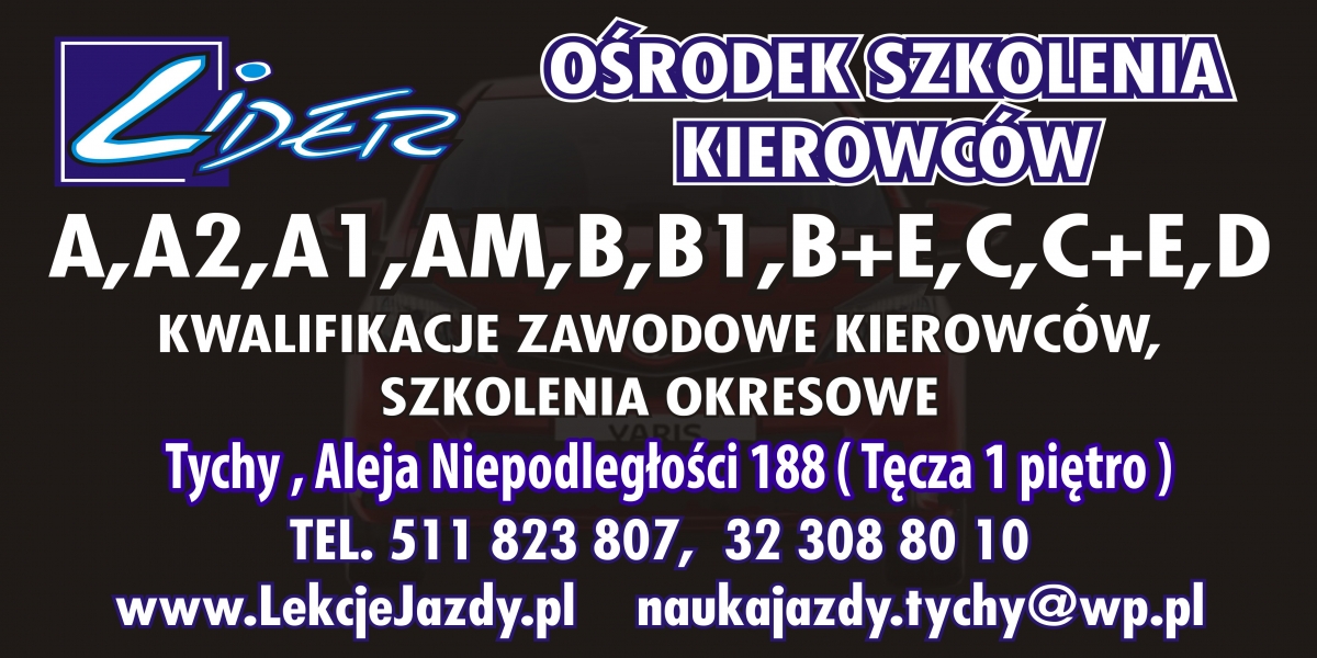 Założycielem szkoły LIDER jest mgr inż. Edwin Adamowicz - znakomity instruktor cieszący się bardzo dobrą opinią i posiadający duże doświadczenie w tej dziedzinie.Każdy kursant traktowany jest indywidualnie, według swoich możliwości i potrzeb. Zarówno zajęcia teoretyczne jak i praktyczne prowadzone są w taki sposób, aby wszyscy uczestnicy kursu czerpali z nich maksymalne korzyści.Obecnie LIDER posiada Ośrodek Szkolenia Kierowców w Tychach przy ulicy Niepodległości 188 (Tęcza - 1 piętro nad Stokrotką) oraz w Łaziskach Górnych, Plac Ratuszowy 5 d. Dzięki profesjonalnemu podejściu oraz wysokim kwalifikacjom możemy pochwalić się wyjątkowo dużą zdawalnością naszych kursantów. Priorytetem dla nas jest, aby osoba ucząca się u nas zdała państwowy egzamin na prawo jazdy za pierwszym razem!