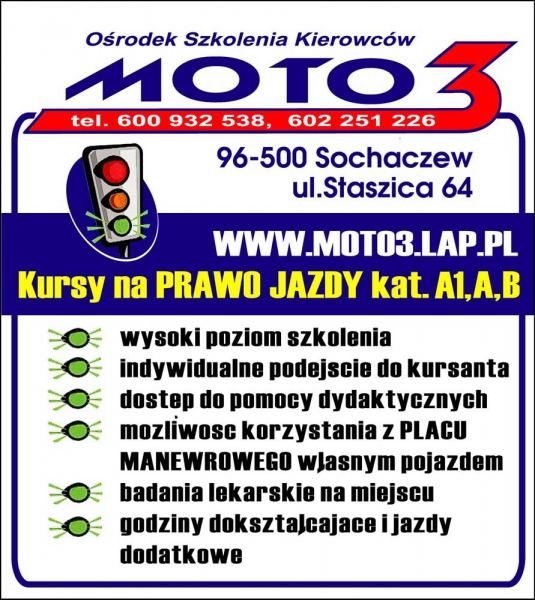 Jesteśmy nowoczesną szkołą nauki jazdy. Najważniejszą misją firmy MOTO3, jest świadczenie wysokiej jakości usług szkoleniowych. Nadrzędnym celem, który przyświeca naszej działalności, jest maksymalne podnoszenie poziomu jakości tychże usług. Staramy się, aby nasi Klienci przystępując do egzaminu państwowego byli przygotowani w sposób, który zapewni Im pomyślne jego zdanie.