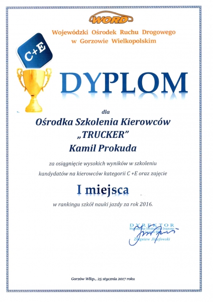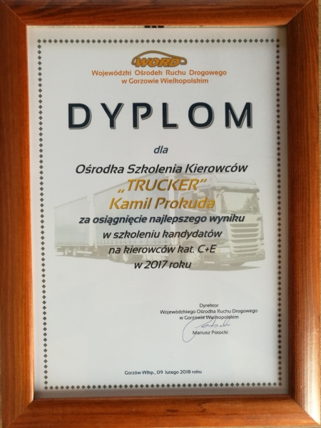 Nasz Ośrodek jako jeden z niewielu szkoli najnowszym systemem SPS. Zapraszamy na Nasza stronę internetowa www.trucker.net.pl. Prowadzimy nabór na kurs kwalifikacji wstępnej przyspieszonej. Zadzwoń do Nas i dowiedz się więcej. Zawsze pytaj o aktualną promocję obowiązującą w Naszej szkole. Ośrodek Szkolenia Kierowców TRUCKER prowadzi kursy nauki jazdy z wykorzystaniem najnowszych i najskuteczniejszych zasad nauczania w oparciu o wiedzę psychologiczną na temat procesów uczenia się, coaching i mentoring. Posiadamy bogate zaplecze mulitimedialne, które wykorzystujemy podczas kursu teoretycznego. Nasze pojazdy spełniają wszystkie wymogi dotyczące szkolenia i egzaminowania kandydatów na kierowców oraz są identyczne jak na egzaminie państwowym przeprowadzonym przez Wojewódzki Ośrodek Ruchu Drogowego w Gorzowie. Nasza flota:- MAN TGL 12.250,- MAN TGL 12.240,- PRZYCZEPA SPIER ZPL 250Od początku działalności Nasza szkoła nauki jazdy cieszy się dobrą opinią wśród kursantów i jest polecana jako solidny Ośrodek Szkolenia Kierowców. Zajmujemy pierwsze miejsca w corocznym rankingu zdawalności w ramach szkolenia z kategorii C,C+E