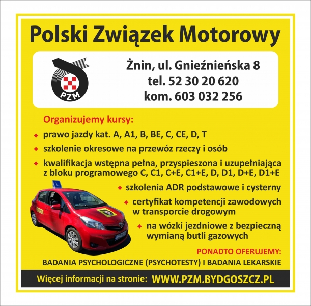 Nasz Ośrodek Szkolenia Kierowców prowadzi następujące kursy prawo jazdy: • A,A1,A2,B,BE,C,CE,D,T.Godziny otwarcia :pon.-pt. 7.00-16.00,Sob. 7.00-12.00 Tel. 52 30 20 620 , 603 032256. Aby rozpocząć kurs na prawo jazdy należy wcześniej uzyskać tzw. Profil Kandydata na Kierowcę (PKK). W tym celu należy udać się do starostwa ( właściwego ze względu na miejsce zamieszkania) aby złożyć następujące dokumenty: 1. Wniosek o wydanie prawa jazdy 2. Pisemna zgoda rodzica lub opiekuna (jeżeli kandydat nie ma ukończonych 18 lat) 3. Orzeczenie lekarskie 4. Orzeczenie psychologiczne ( wymagane przy zapisie na kat. C,CE,D,DE) 5. Kolorową fotografię (3,5x4,5) 6. Kserokopię prawa jazdy (jeżeli posiada się inne kategorie) Po otrzymaniu PKK można się u nas zapisać na kurs. TYLKO TERAZ!!! M E G A Z N I Ż K A -> NA KURS KAT. C, C+E ---> KWALIFIKACJA RABAT 400 ZŁSKORZYSTAJ tylko teraz 8800 zł KIEROWNIK OŚRODKA SZKOLENIA - DANUTA BAJDZIAK-BĄKOWSKA (TEL. 693 529 047)