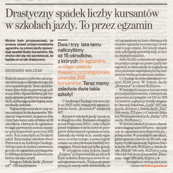 Wolimy cieszyć się z miana NAJBARDZIEJ UTYTUOWANEJ SZKOŁY woj. świętokrzyskiego, czego dowodem są OFICJALNE (nie naciągane!) RANKINGI ZDAWALNOŚCI egzaminów w WORD Kielce, dostępne na stronie Urzędu Miasta: www.um.kielce.pl/osk