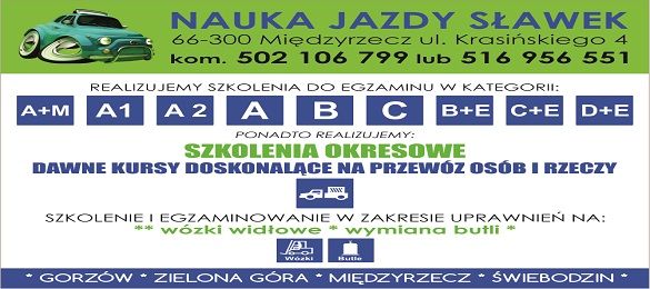 KategoriaB AA1A2AMBB+ECC+EDTC, C+EWybierz rodzaj kursuWykłady i praktykaWięcej filtrów kursówWybierz opcje kursuManualna skrzynia 0 opinii 1 Nauka Jazdy Sławekul. Krasińskiego 4 (Międzyrzecz)ul. Kawaleryjska 4, 69-200 SulęcinCeny i terminy Najbliższy kurs: codziennie Szkolimy w kategoriach: A, A1, B, C, D, B+E, C+E, A2, AM, T, C, C+E Szkoła zdobyła 0 na 4 odznakZobacz co oznaczają > 1 opinia bardzo dobry (ocena z dnia 26.07.2012) zdane za 1 razem !! Egzamin na prawo jazdy zdany za 1 razemWięcej 2 Prywatna Szkoła Jazdy MEGAul. Dudka 2 69-200 SulęcinCeny i terminy Najbliższy kurs: CodziennieSzkolimy w kategoriach: 0 opinii 3 As. Szkoła kierowcówKilińskiego 2c lok. 4 69-200 SulęcinCeny i terminy Najbliższy kurs: CodziennieSzkolimy w kategorii B 0 opinii 4 Joker. Szkoła KierowcówLipowa 21 lok. 1 69-200 SulęcinCeny i terminy Najbliższy kurs: CodziennieSzkolimy w kategoriach: Jak przygotować się do zdania kursu na prawo jazdy w mieście Sulęcin?Okres w którym podejmujemy myśl o tym, że chcemy zrobić prawo jazdy jest często bardzo istotnym punktem w życiu. Posiadanie pozwolenia na poruszanie się daje nam wolność. Jeżeli chcesz zdać egzamin na prawo jazdy w mieście Sulęcin to rozpocznij od zrobienia Profilu Kandydata na Kierowcę. Zrobisz go w wydziale komunikacji właściwym według Twojego aktualnego miejsca zamieszkania. Dalej musisz znaleźć OSK, gdzie zrobisz kurs prawa jazdy w mieście Sulęcin. Do odbycia kursu na prawo jazdy potrzeba przejść badanie lekarskie. Numer do lekarza otrzymasz od OSK, ponieważ często współpracują na stałe z jedną osobą. Aby bardzo dobrze przygotować się do zrobienia kursy na prawko należy nauczyć się teorii. Egzamin teoretyczny jest wymaganą częścią kursu. Przydatny w tym celu będzie test na prawko, który pomoże w zapoznaniu się z oficjalnymi pytaniami na prawo jazdy.