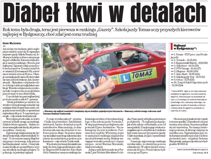 Moja przygoda z prawem jazdy zaczęła się roku temu w innej bydgoskiej szkole. Po trzech oblanych egzaminach, na korytarzu w wordzie usłyszałem jak jeden z kursantów zachwala Tomasa, że super szkoła i że egzamin bez problemu zdany. Sprawdziło się! Po kilku lekcjach w tej szkole dowiedziałem się więcej niż przez cały kurs. Potrafili nastawić mnie na egzamin, a parkowania które były czarną magia okazały się mega przyjemne. Jeżeli chcesz się porządnie nauczyć jeżdzić i bezpiecznie parkować serdecznie polecam! A Panu Andrzejowi dziękuję za solidne przygotowanie i mnóstwo dobrych rad! Marek J.