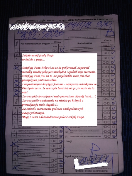 O SZKOLESzanowni Państwo, Bardzo miło nam poinformować, iż nasza Szkoła w sierpniu 2016 roku zajęła 2 miejsce w powiecie Olsztyńskim w plebiscycie Gazety Olsztyńskiej: "ELKA na 5 z plusem". Z dumą dodamy, że dzięki Państwa uznaniu to nie pierwszy nasz taki sukces, bowiem już w roku 2012 nasza Szkoła wygrała plebiscyt gazety Nasz Olsztyniak: "ELKA nad Elkami" a w roku 2013 zajęliśmy 2 miejsce w plebiscycie Gazety Olsztyńskiej "ELKA na 5 z plusem". Szczegóły dotyczące wszystkich sukcesów "Pasji" znajdą Państwo na naszej stronie www.pasja-naukajazdy.pl w zakładce NAGRODY.Dziękujemy !!Nazywam się Arkadiusz Przybyszewski. Jestem instruktorem-wykładowcą z wieloletnim doświadczeniem.Z wykształcenia jestem nauczycielem, co bez wątpienia pomagało mi w nauczaniu przyszłych kierowców. Zamiłowanie do motoryzacji, pedagogiczne wykształcenie, wiedza, duże doświadczenie w prowadzeniu zajęć teoretycznych i praktycznych oraz satysfakcja z umiejętnego przekazywania wiedzy przyszłym kierowcom spowodowały, iż praca jako instruktor nauki jazdy stała się moją pasją. Stąd też nazwa mojej własnej szkoły, do której serdecznie zapraszam. Instruktorki i Instruktorzy pracujący w „Pasji” to osoby, z którymi współpracowałem w poprzednich latach, dlatego wiem, że ich wiedza, wieloletnie doświadczenie, profesjonalizm i zaangażowanie są na tyle duże by sprostać Państwa oczekiwaniom. Dla nas najważniejsze jest zadowolenie i satysfakcja z wyboru mojej szkoły, dlatego gwarantuję, iż prowadzone przez nas szkolenia są najwyższej jakości bo u nas każdy kursant jest VIPem.Wyróżnia nas także to, iż prowadzimy tylko jedną kategorię prawa jazdy - kategorię "B", w której się specjalizujemy.Dla nas zajęcia teoretyczne są równie bardzo ważne jak zajęcia praktyczne, dlatego przeprowadzamy je w sposób od wielu lat preferowany przez naszych kursantów czyli w formie ćwiczeń i wykładów głównie "MÓWIONYCH" z Wykładowcą i Ratownikiem Medycznym w ustawowym wymiarze 30 godzin lekcyjnych (30 x 45 min.) Kładziemy tu nacisk na przekaz SŁOWNY,nie ograniczając się tym samym tylko do "puszczania" filmów którymi to jedynie ten przekaz uzupełniamy.(Kursanci w swoich opiniach dodanych nam poniżej to potwierdzają za co bardzo dziękujemy bo to świadczy o docenieniu naszej pracy i o potrzebie prowadzenia wykładów w taki właśnie sposób a nie inny.).Dobry PODRĘCZNIK i aktualne TESTY potrzebne do nauki udostępniamy każdemu BEZPŁATNIE na WŁASNOŚĆ.Jeśli chodzi o szkolenie praktyczne (jazda samochodem) kursantka czy też kursant odbywa w naszej Szkole od początku do końca z JEDNYM i tym samym,wybranym przez siebie instruktorem bądź instruktorką a dzięki temu NIE jeździ codziennie z innym,chociaż nie jest to obligatoryjne.Szkolenie praktyczne trwa u nas zgodnie z ustawą 30 godzin zegarowych.Dla Państwa komfortu i efektywności szkoleń dysponujemy profesjonalnie wyposażoną salą do przeprowadzania zajęć teoretycznych, a do zajęć praktycznych zarówno Fiatami Punto jak i samochodami marki Kia Rio takimi na jakich przeprowadzane są egzaminy państwowe.WSZYSTKIE nasze samochody szkoleniowe zostały zakupione jako nowe i są na bieżąco starannie przeglądane i serwisowane TYLKO w AUTORYZOWANYCH Stacjach Obsługi FIATA oraz KIA. Dodatkowym atutem jest miła i fachowa obsługa w biurze szkoły, gdzie będą mogli Państwo uzyskać wszelkie szczegółowe informacje, bądź zapisać się na kurs. Szkoły które w swojej ofercie mają kilka kategorii prawa jazdy takich jak kategoria A,B,C,C+E,D itd.naturalnie otrzymują więcej opinii od swoich kursantów ze względu na ich liczebność niż Szkoła taka jak nasza która prowadzi TYLKO JEDNĄ kategorię prawa jazdy czyli kategorię "B".Mimo to jesteśmy w ŚCISŁEJ CZOŁÓWCE rankingu a co za tym idzie jesteśmy wyjątkowo dumni że tak duża liczba opinii wystawionych nam dotyczy TYLKO JEDNEJ kategorii prawa jazdy którą się zajmujemy czyli kategorii "B" będącej naszą domeną,dlatego zachęcamy Państwa serdecznie do wzięcia pod uwagę tego faktu przy wyborze Szkoły gdzie każdy kursant dodając opinie swojej szkole w tym rankingu zaznacza jakiej kategorii prawa jazdy kurs przechodził co przekłada sìę na ilość opinii dla poszczególnych kategorii.Warto pamiętać iż kurs na prawo jazdy każdy z nas robi raz w życiu,dlatego jeżeli chcą Państwo solidnie i rzetelnie być przygotowani zarówno od strony teoretycznej jak i praktycznej,zapraszamy do naszej Szkoły!Prosimy sprawdzić na naszej stronie internetowej www.pasja-naukajazdy.pl aktualne promocje w zakładce CENNIK.Pozdrawiam.Arkadiusz Przybyszewski