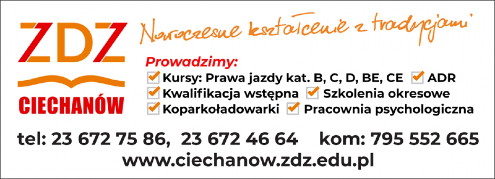 Dzięki profesjonalnemu podejściu naszych instruktorów i wykładowców, zaangażowaniu oraz sumiennym wykonywaniu pracy ZDZ w Warszawie Centrum Kształcenia w Ciechanowie funkcjonuje na lokalnym rynku szkoleniowym od wielu lat. Dowodem naszego zaangażowania w szkoleniu oraz troski o klienta jest fakt, iż większość nowo pozyskanych kursantów zgłasza się z polecenia osób, które wcześniej robiły u nas szkolenie na prawo jazdy lub inny kurs.Wykonujemy szkolenia na kat. B dla osób z orzeczeniem o niepełnosprawności pojazdem przystosowanym do stopnia niepełnosprawności osoby szkolonej.Prowadzimy szkolenia na kategorie A, A2, B, B+E, C, C+E, DW cenie kursu pojedziesz z nami na plac manewrowy do WORD-u Zapewniamy:- nasi kursanci mają stały dostęp do indywidualnego konta na Portalu OSK - aktualnie używanych pytań egzaminacyjnych, (aktualizowanych na bieżąco).- sale wykładowe z wykorzystaniem technik multimedialnych- profesjonalny plac manewrowy- godziny zajęć teoretycznych dostosowanych do danej grupy kursantów, - elastyczne godziny zajęć praktycznych dostosowane do wymagań osób szkolonych- możliwość rozłożenia płatności za kurs na raty Pojazdy szkoleniowe:Hyundai i20 - kat B - Suzuki Swift - kategoria B- DAF + przyczepa ciężarowa - kategoria C, C+E. Oferujemy także- kurs kwalifikacji wstępnej przyśpieszonej i szkolenie okresowe dla kierowców wykonujących transport drogowy rzeczy i osób- badania psychologiczne dla kierowców- kurs "Przewóz towarów niebezpiecznych - ADR"- operator koparko-ładowarki